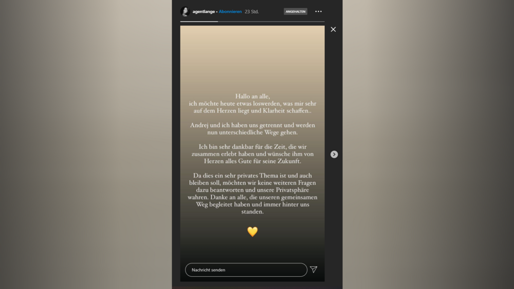 sie hätten sich im guten getrennt und seien dankbar für die gemeinsame zeit, teilten jetzt beide via instagram-story mit. zu den gründen für die trennung sagten sie nichts. "da dies ein sehr privates thema ist und auch bleiben soll, möchten wir keine weiteren fragen dazu beantworten und unsere privatsphäre wahren", hieß es weiter.