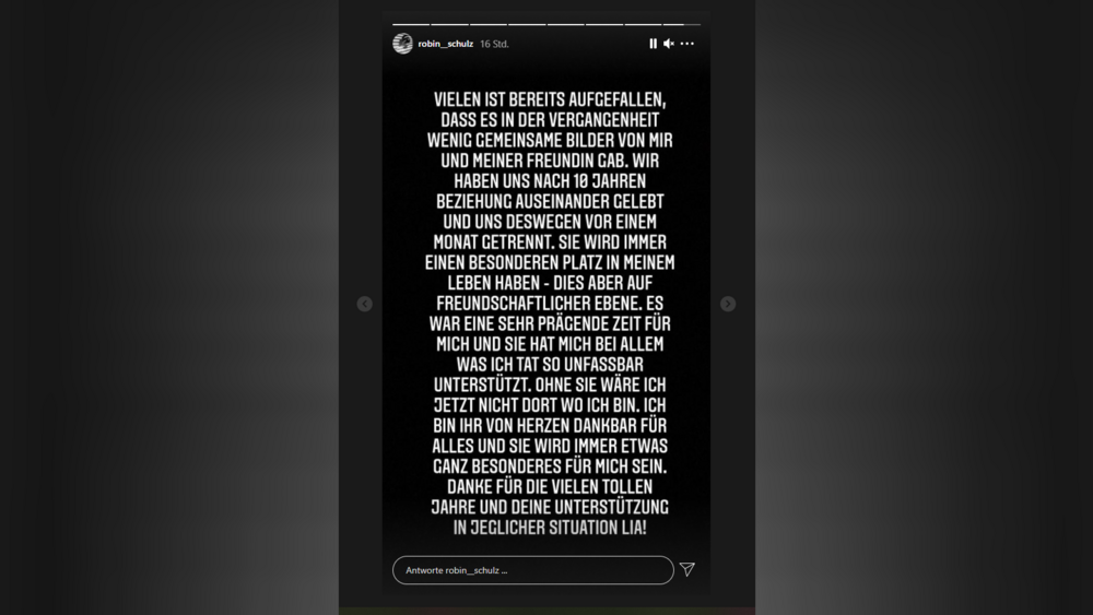 in seiner insta-story schrieb robin: "wir haben uns nach zehn jahren auseinandergelebt und uns deswegen vor einem monat getrennt." allerdings fließe zwsichen beiden kein böses blut. "sie wird immer einen besonderen platz in meinem leben haben – dies aber auf freundschaftlicher ebene", so der 34-jährige. er habe seiner ex eine menge zu verdanken und sie sei ihm in den vergangenen jahren eine "unfassbare" unterstützung gewesen.