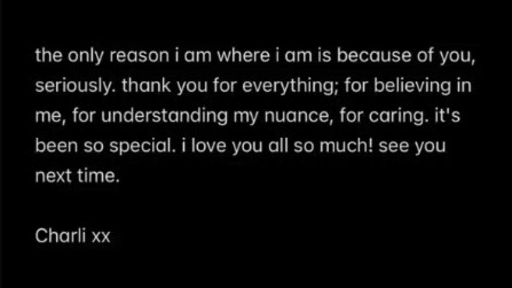 „Ich bin nur dank euch da, wo ich bin, wirklich. Danke für alles; danke, dass ihr an mich geglaubt habt, meine Nuancen verstanden habt und euch um mich gekümmert habt. Es war so besonders. Ich liebe euch alle so sehr! Bis zum nächsten Mal. Charli xx“.
